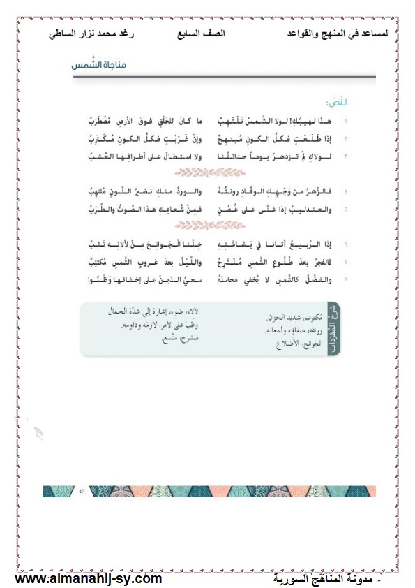 حل وشرح قصيدة مناجاة الشمس في اللغة العربية للصف السابع الفصل الثاني 2019 2020