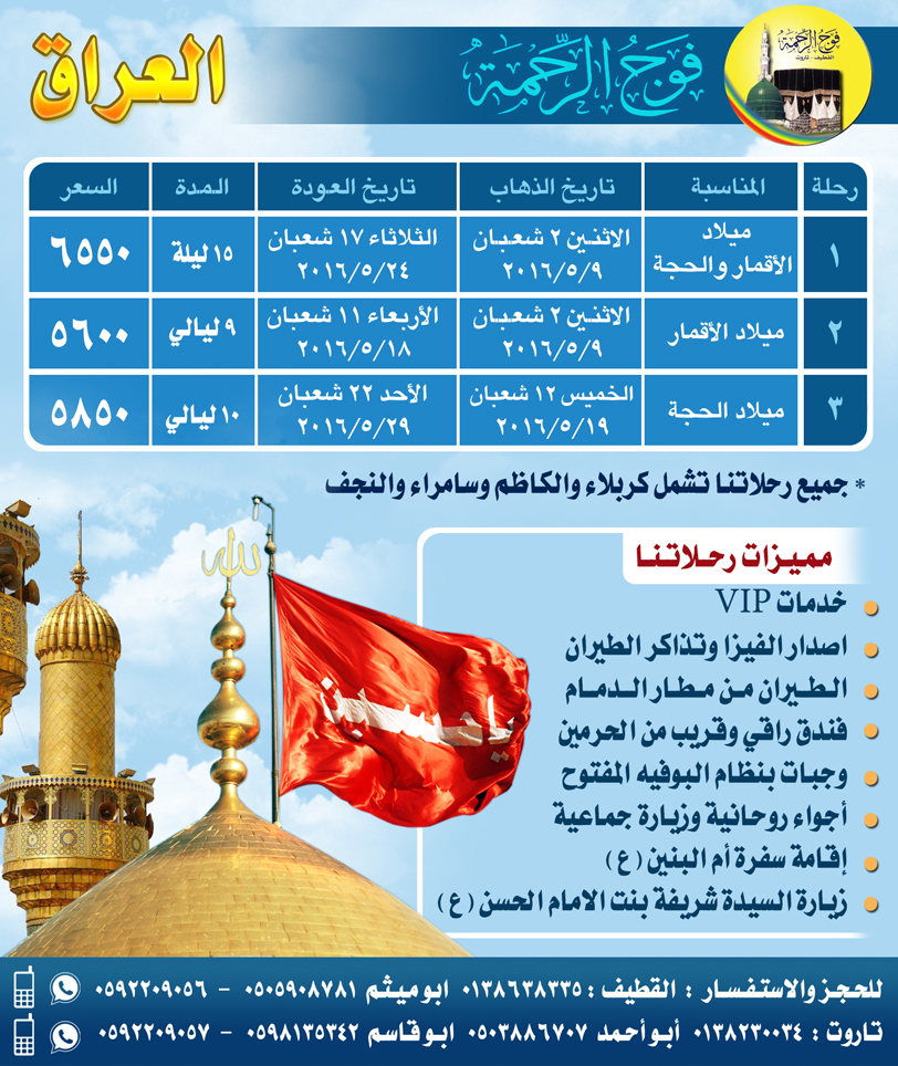 خدمة طوبى عروض حملة فوج الرحمة لزيارة العراق ورحلات العمرة الرجبية