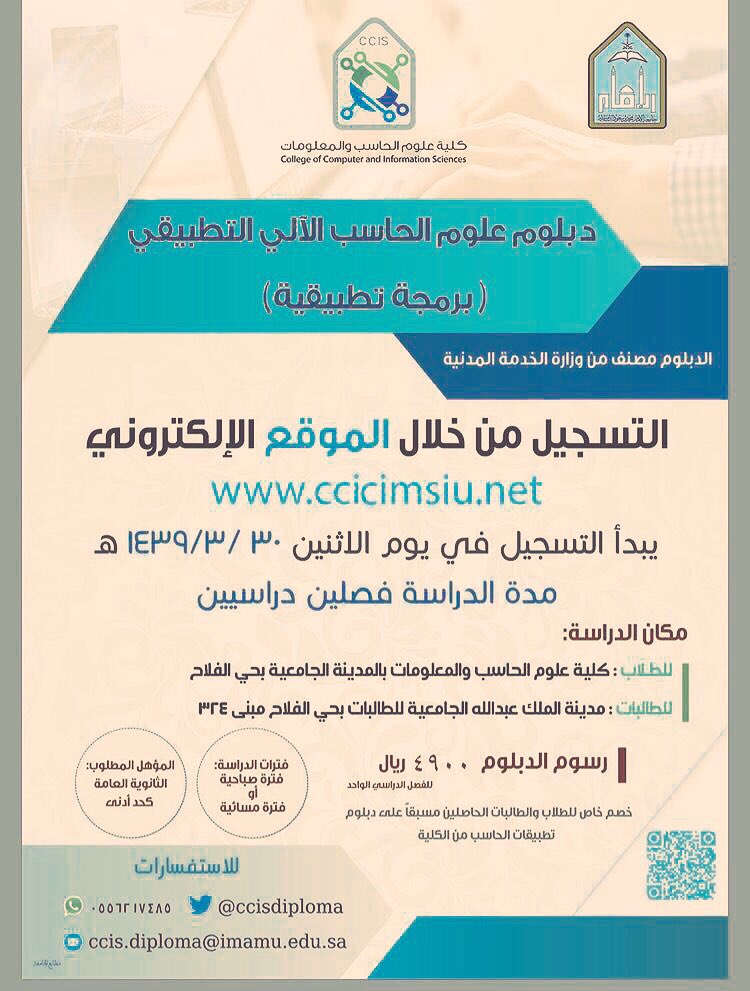 جامعة الإمام محمد بن سعود الإسلامية On Twitter كلية علوم الحاسب والمعلومات تعلن عن البدء في استقبال طلبات الإلتحاق بدبلوم علوم الحاسب الآلي التطبيقي برمجة تطبيقية للفصل الدراسي الثاني وذلك بشكل ألكتروني